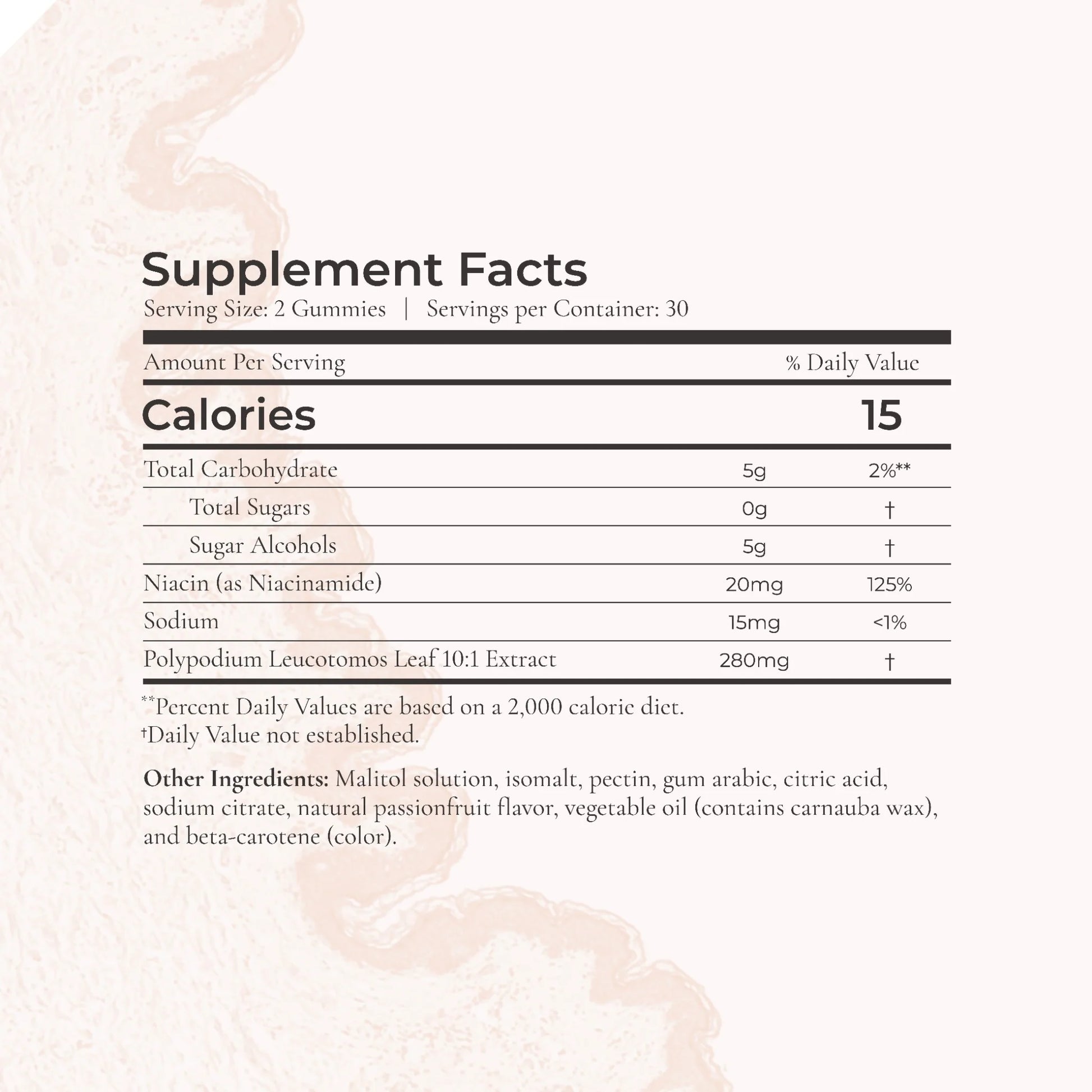 Our Sol Defense Vitamin supports your skin’s natural ability to protect against sun damage and oxidative stress. Powered by clinically studied ingredients like Polypodium Leucotomos, Niacinamide, and other potent antioxidants, these gummies is a perfect compliment to any SPF sunscreen and helps reduce the appearance of acute and chronic photoaging, redness and sun damage from the inside out.