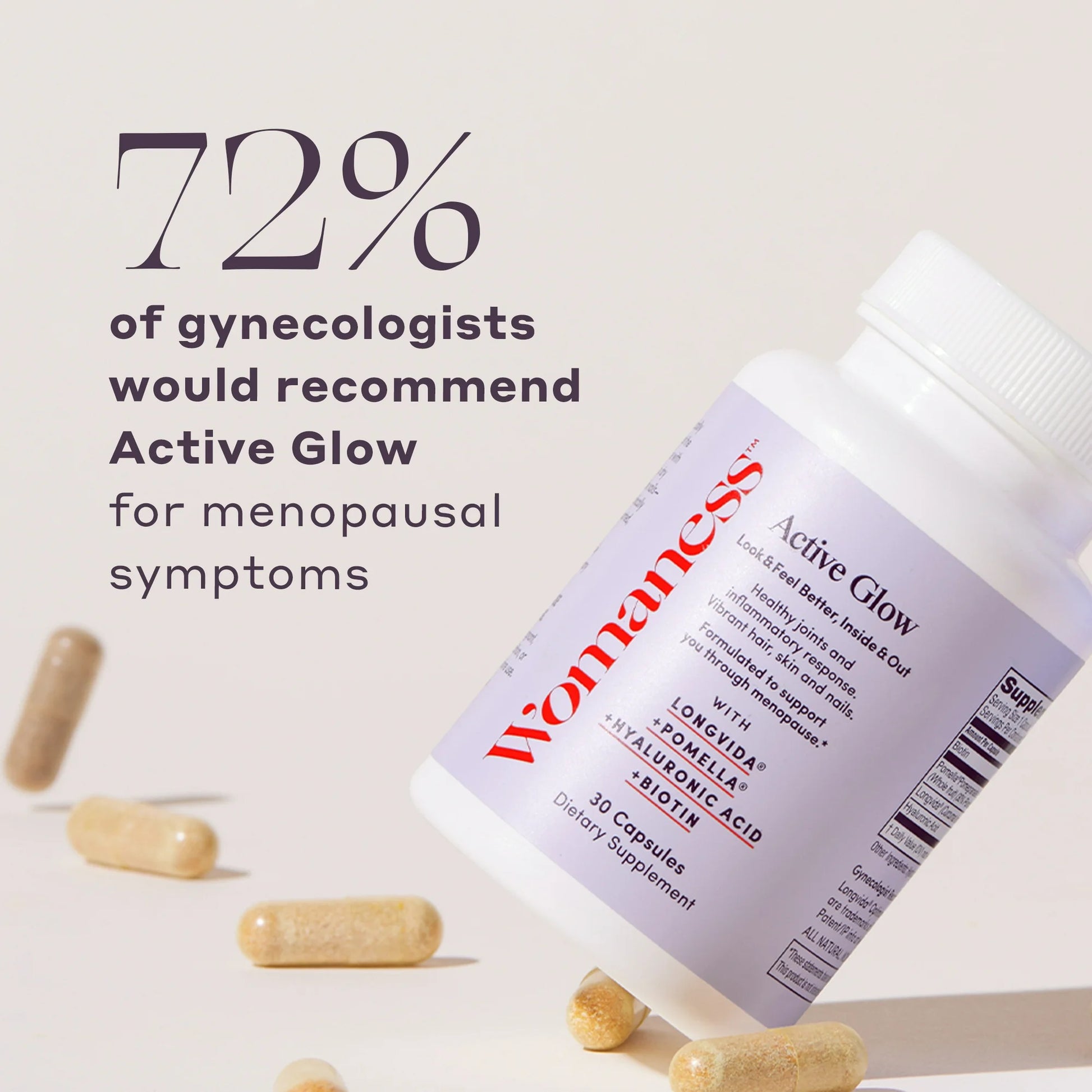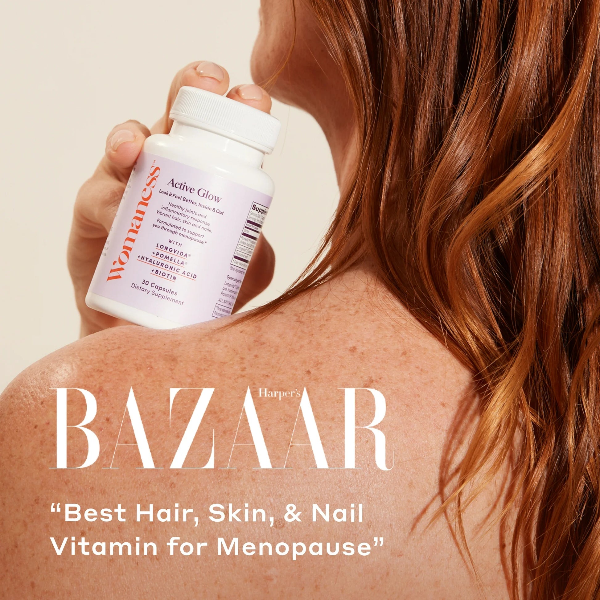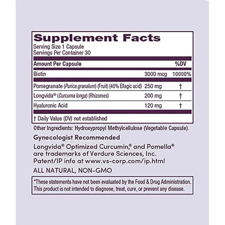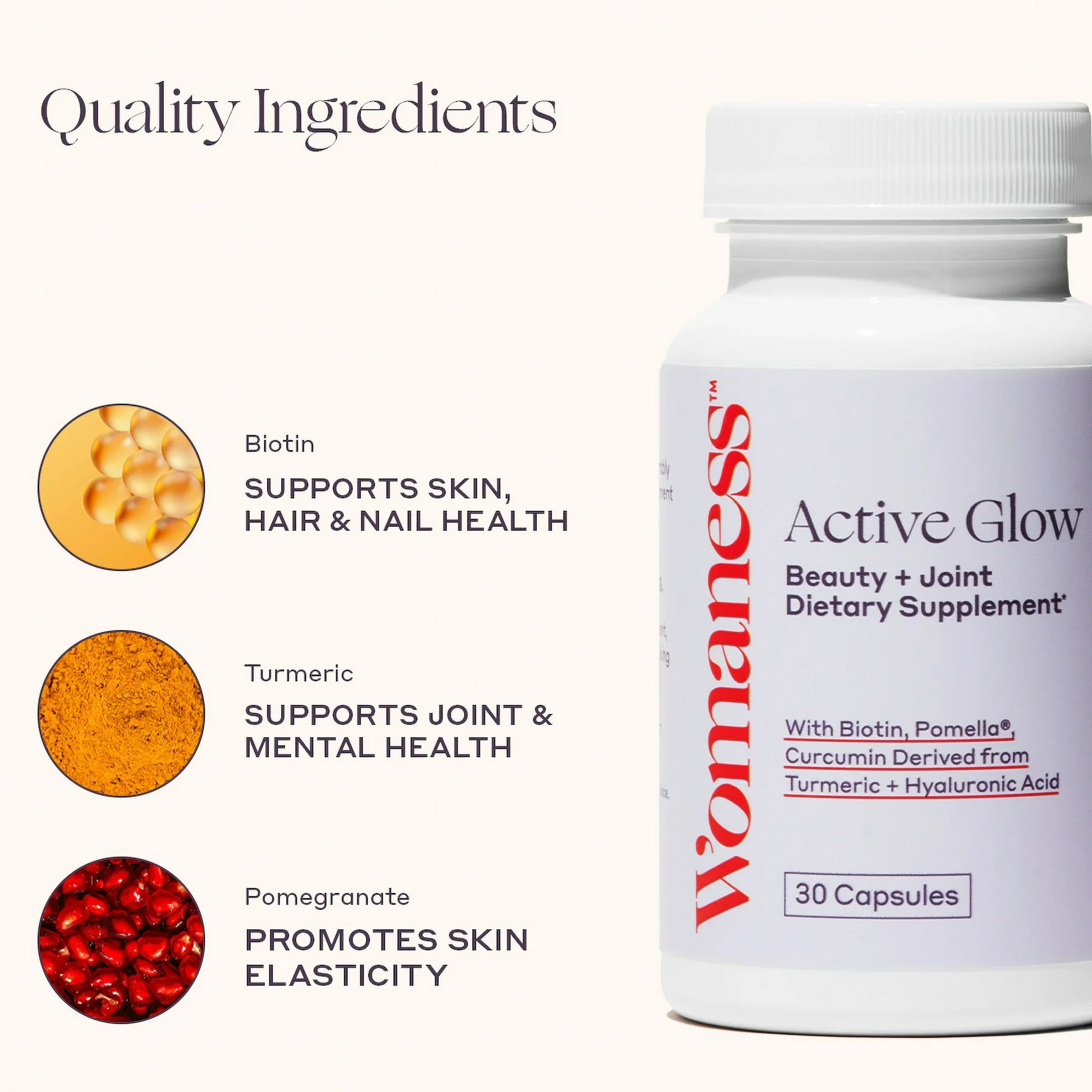 Womaness Active Glow Hair Skin and Nails Vitamins - Biotin, Longvida Curcumin & Hyaluronic Acid Supplements for Joint Health, Dry Skin & Thinning Hair (30 Capsules)